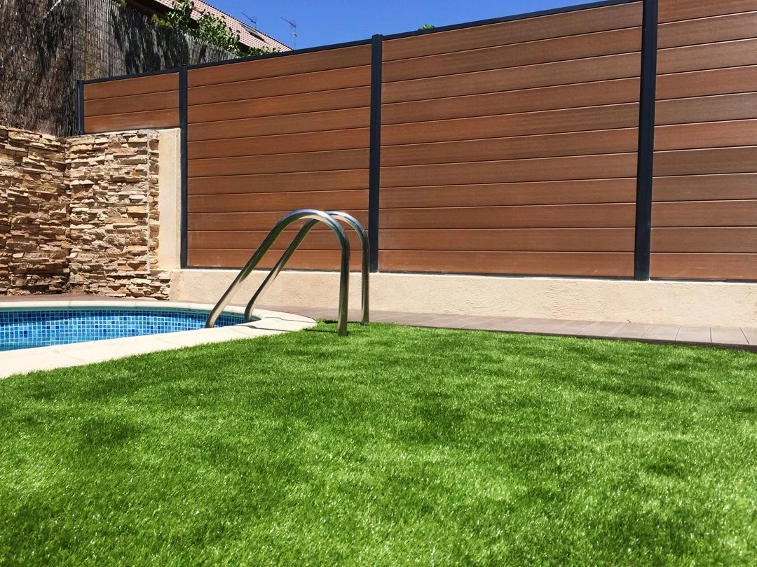 Swimming pool with ladder, artificial grass, composite wood fence, and stone wall in backyard.